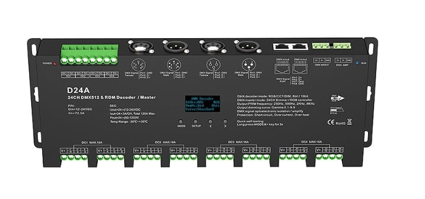 LED DMX512 Driver - 24 Channel - 12-24V DC 24x5A - OLED - Decoder/Master DMX - D24A, este un dispozitiv sub forma unui driver LED cu douăzeci și patru de canale pentru care putem specifica adrese digitale individuale și putem obține acces la control, de exemplu, iluminare LED RGB multicoloră. Controlul în cazul set-top box-urilor bazate pe DMX este definit ca o schimbare a luminozității, a culorii RGB sau a temperaturii de culoare CCT, deoarece fiecărei ieșiri i se poate atribui o caracteristică la care se va face accesul folosind adresa sa predeterminată. Obținerea controlului asupra set-top box-ului este posibilă prin recepționarea unui semnal digital DMX512, care este decodat și convertit într-un semnal PWM, permițându-vă să conectați, de exemplu, o bandă LED RGB + CCT. Driverul LED DMX512 D24A permite, de asemenea, funcțiile de atribuire a unei astfel de adrese de la nivelul unui afișaj OLED dinamic, funcționând apoi ca un emițător DMX. Controlerul DMX512 D24A vă permite să încărcați până la douăzeci și patru de ieșiri cu un curent de 5A la o tensiune nominală de 12-24VDC. Datorită utilizării protocolului RDM, este posibil să se determine adresa set-top box-ului folosind un transmițător DMX512 (de exemplu, consolă) sau de la nivelul set-top box-ului propriu-zis folosind afișajul LCD disponibil. În plus, receptorul are intrări universale implementate prin porturile RJ45, XLR3 și XLR5.
