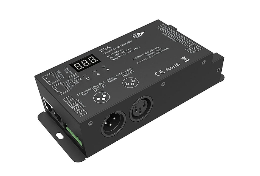 Receptor LED SPI (DMX512) - RGB - pentru benzi LED digitale - 8A 5-24V DC - RJ45/XLR3 - DSA, este un dispozitiv sub forma unui decodor DMX512, folosind semnalul digital SPI la ieșire, care vă permite să controlați iluminarea LED RGB digitală (de exemplu, benzi digitale pixel RGB LED) Putem folosi multe tipuri de benzi LED digitale RGB pentru decodor. Dispozitivul acceptă până la 900 de pixeli. Accesul la decodor este posibil printr-o conexiune prin cablu folosind sistemul de control DMX512. Folosește terminale cu șurub standard sau conectori XLR3 și RJ45 utilizați în acest sistem de comunicații. Conectarea receptoarelor cu controlere LED este posibilă și prin comunicare radio cu o anumită frecvență a semnalului. Raza de acțiune a unei astfel de comunicații este asigurată de o conexiune wireless pe o rază de 30 de metri într-o zonă deschisă. Dispozitivul are un afișaj LCD încorporat. Proiectat pentru montare la suprafață. Manopera de înaltă calitate, pe de altă parte, asigură o perioadă de garanție de 60 de luni.