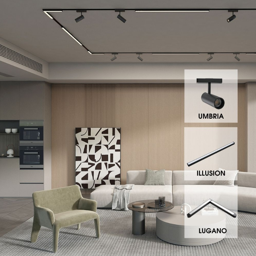 Sistemul de șine magnetice SLIM25 oferă noi oportunități de iluminare plăcută din punct de vedere estetic în încăperi cu diferite aplicații acasă, în camere de hotel, magazine, restaurante. Sistemul include diverse forme și corpuri de iluminat și spoturi de putere, potrivite pentru instalarea pe șine de joasă tensiune pentru încorporat (InTrack) sau pentru instalare în exterior (SlimTrack) – 48V. Toate modelele de corpuri de iluminat din sistemul SLIM25 sunt disponibile în două temperaturi de culoare: 3000K (lumină albă caldă) și 4000K (lumină neutră).